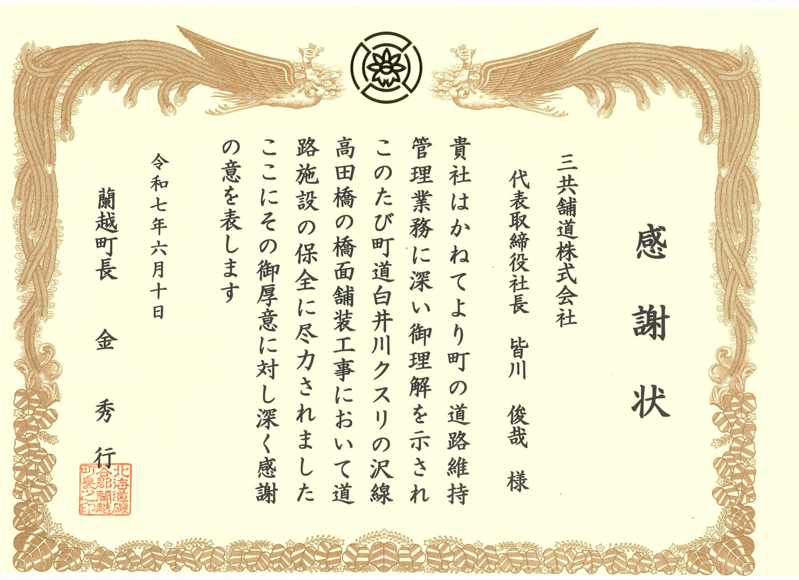 公開: 2025年6月11日 (水曜日) 令和7年5月14日、蘭越町内にて、地域貢献活動の一環として橋面舗装の補修作業を行いました。約40㎡の橋面を安全に配慮しながら舗装し直し、地域の通行環境の向上に努めました。 今後も三共舗道は、地域と共に歩む企業として、社会貢献活動に継続して取り組んでまいります。 蘭越町長 金 秀行 様より感謝状